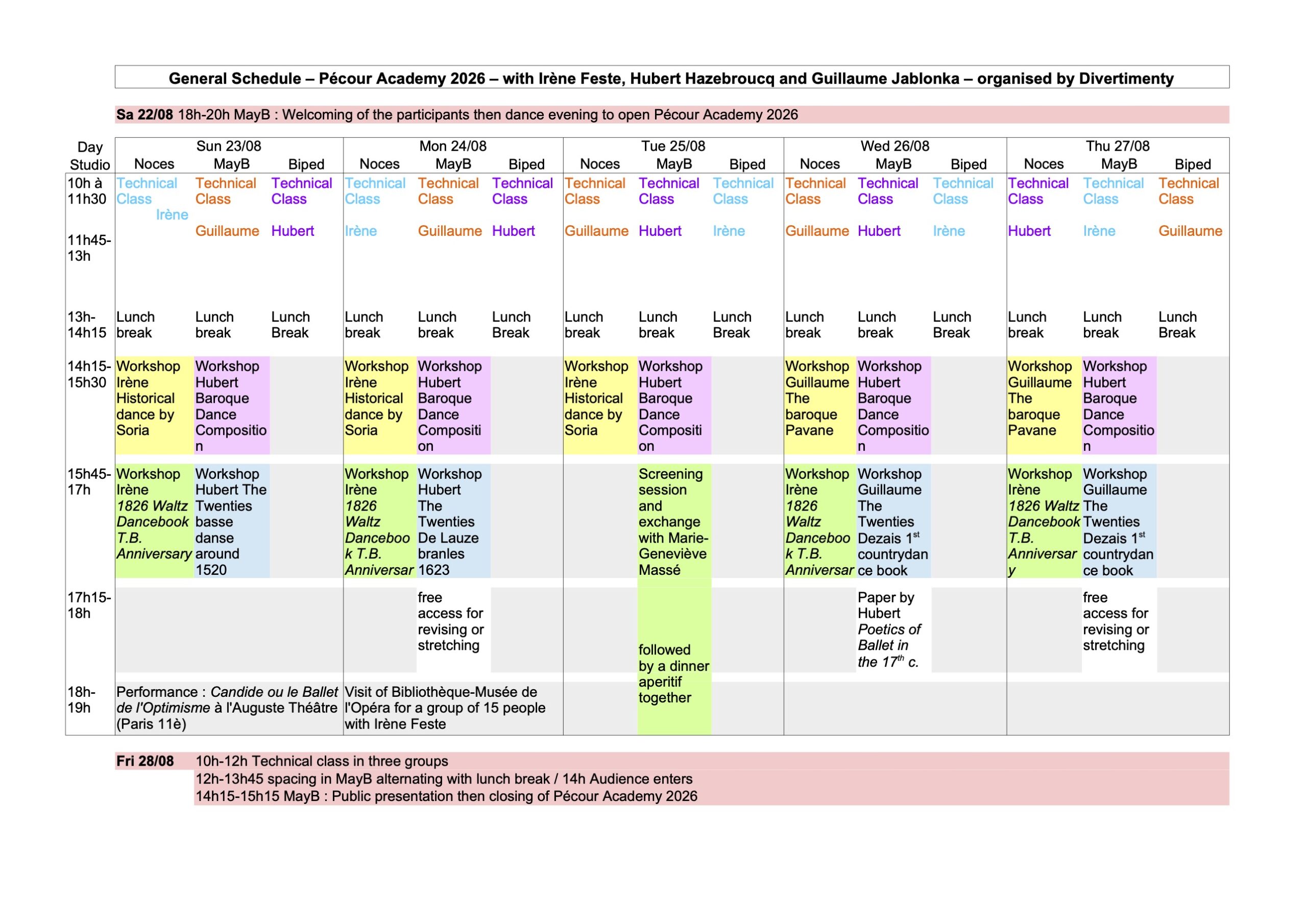 - a performance of Candide or the Ballet of Optimism, creation 2026 of the Company Divertimenty will take place on Sunday, August 23, 2026 at 6 PM at the Auguste Théâtre, 6 impasse Lamier 75011 Paris, M°2 Philippe Auguste. The tickets will soon be on sale, a preferential rate of €18 will be offered to participants from the Académie Pécour.